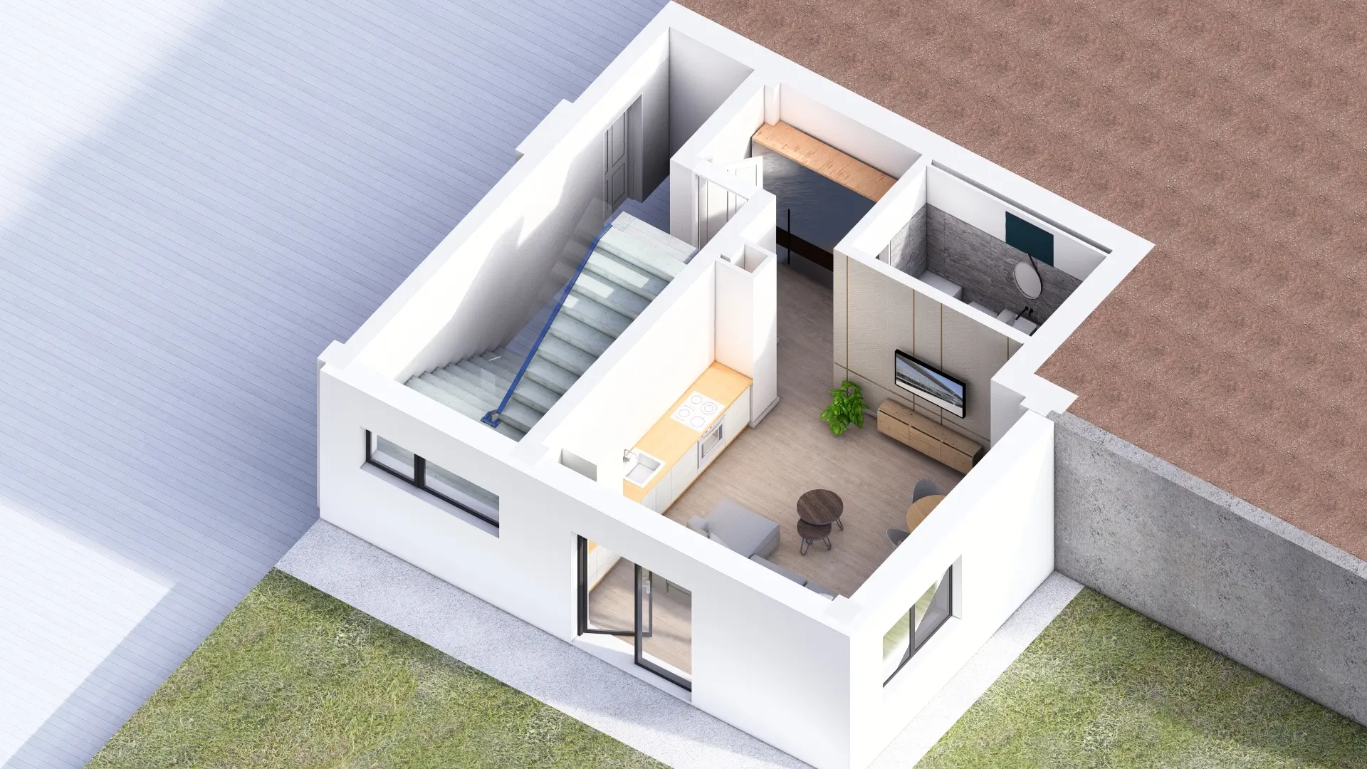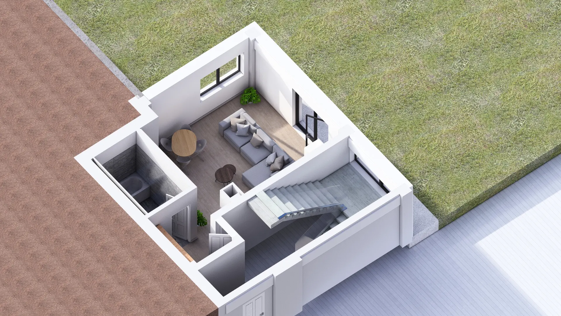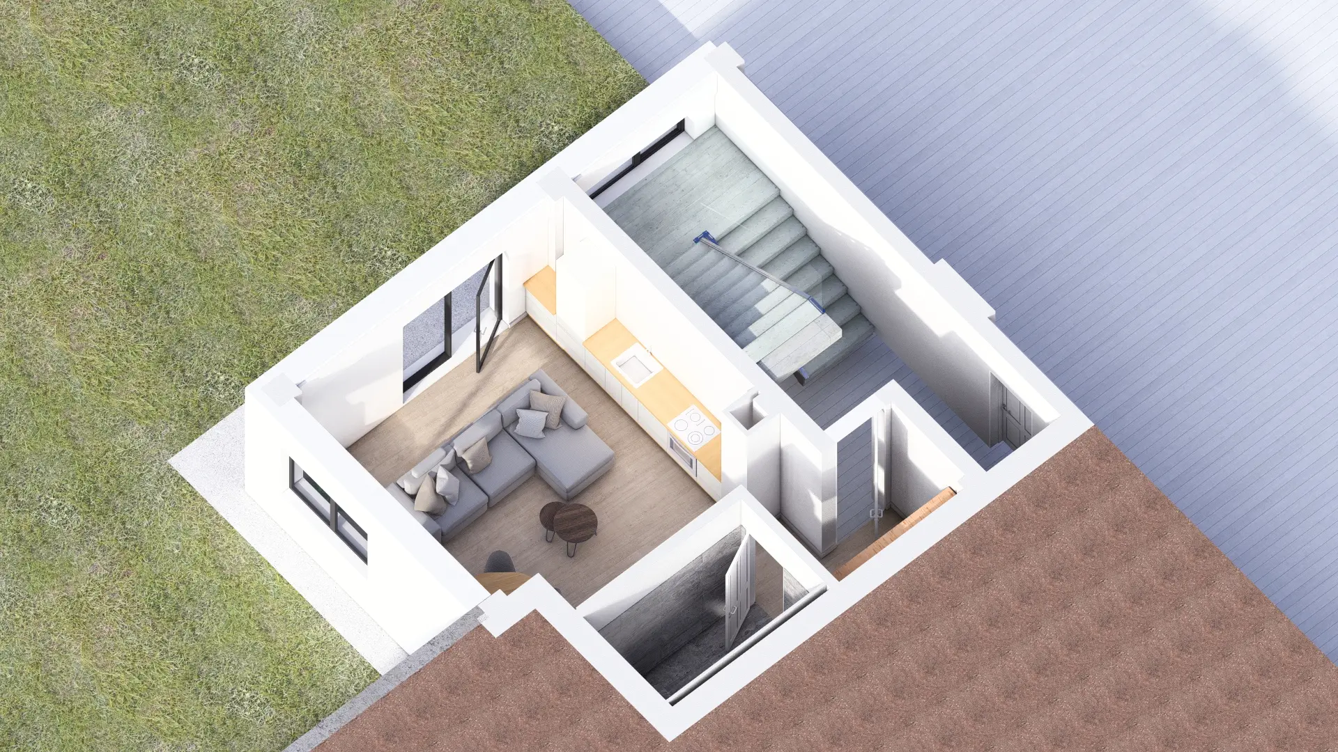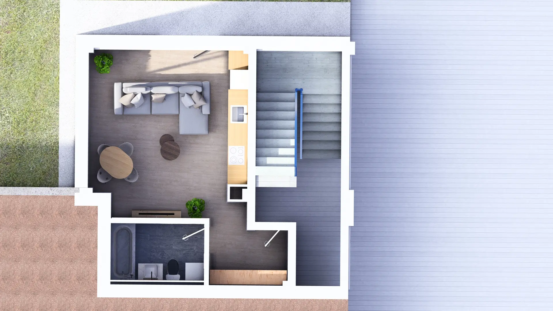 Baie luminoasă, ventilată natural și complet echipată — cadă sau duș la alegere, lavoar, vas WC cu rezervor încastrat și duș igienic. Fiecare client poate opta pentru varianta standard sau pentru pachetul premium al băii (cost suplimentar).