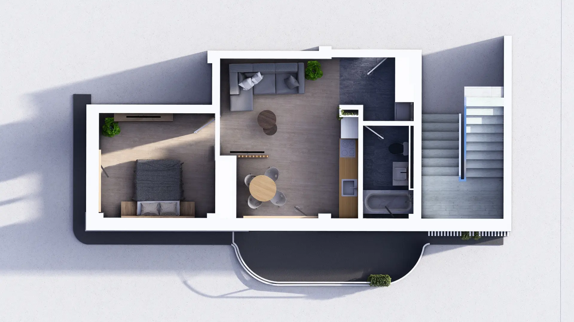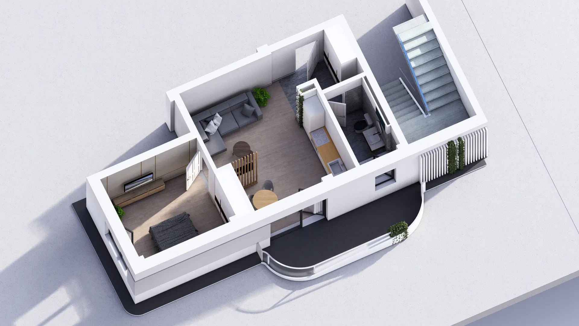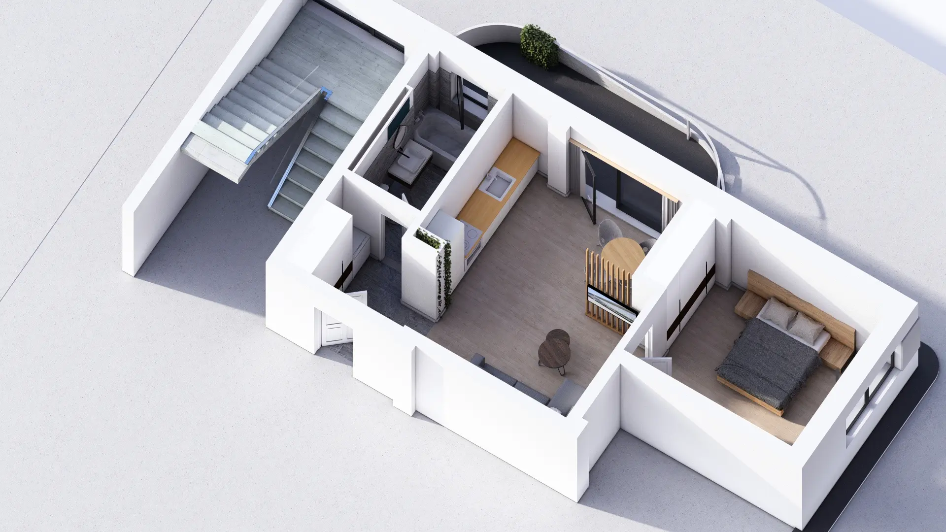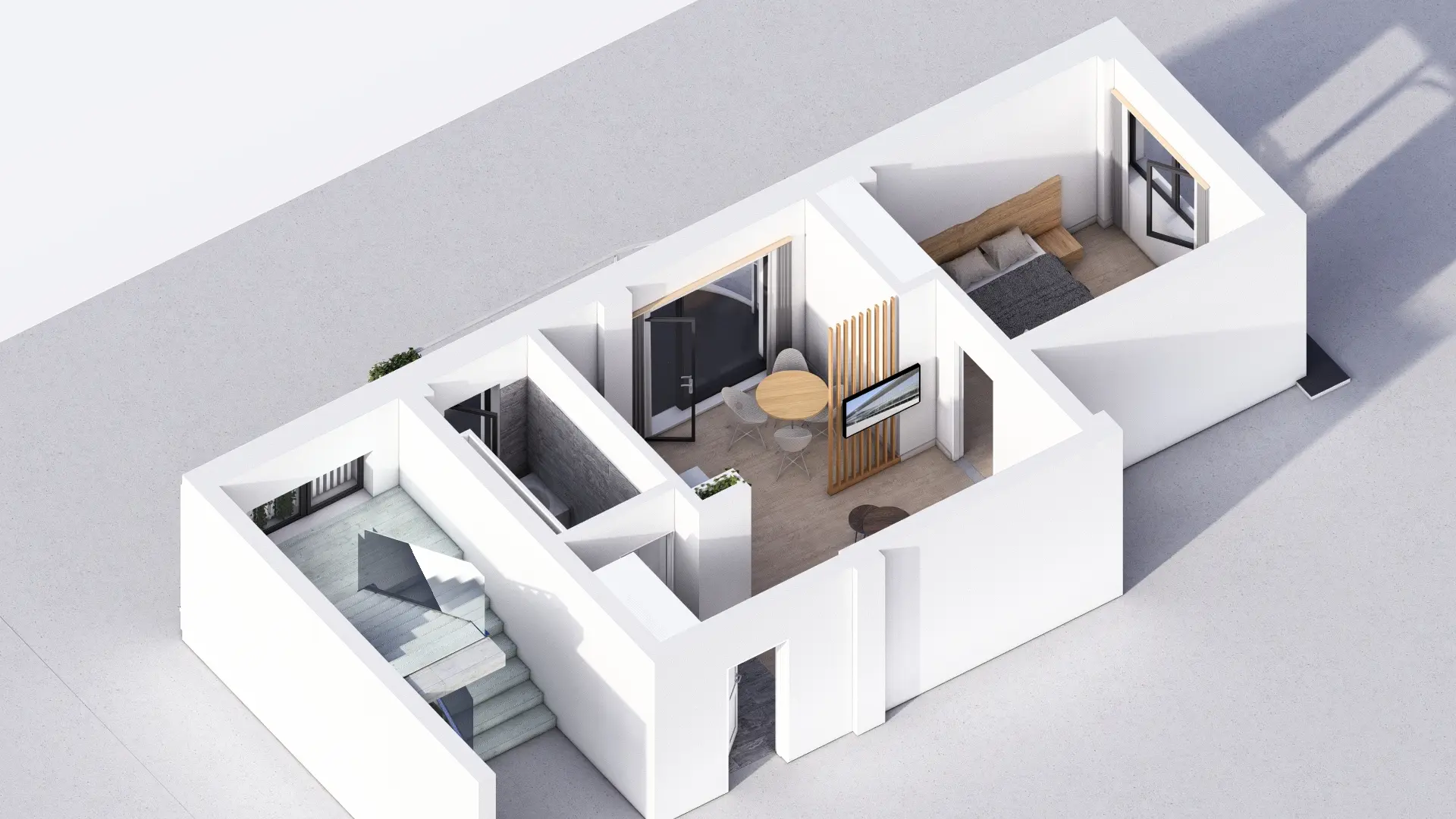 Baie luminoasă, ventilată natural și complet echipată — cadă sau duș la alegere, lavoar, vas WC cu rezervor încastrat și duș igienic. Fiecare client poate opta pentru varianta standard sau pentru pachetul premium al băii (cost suplimentar).