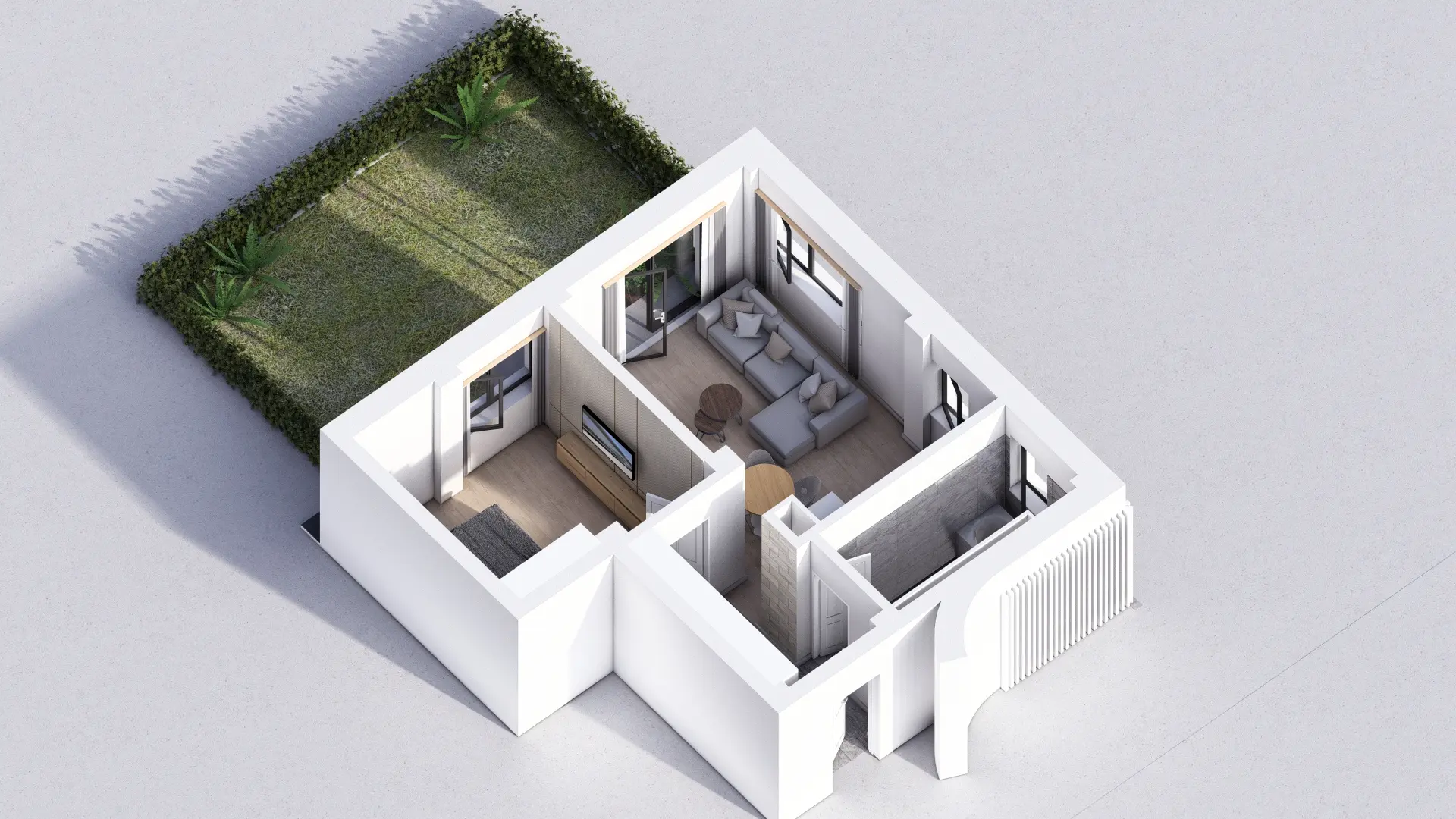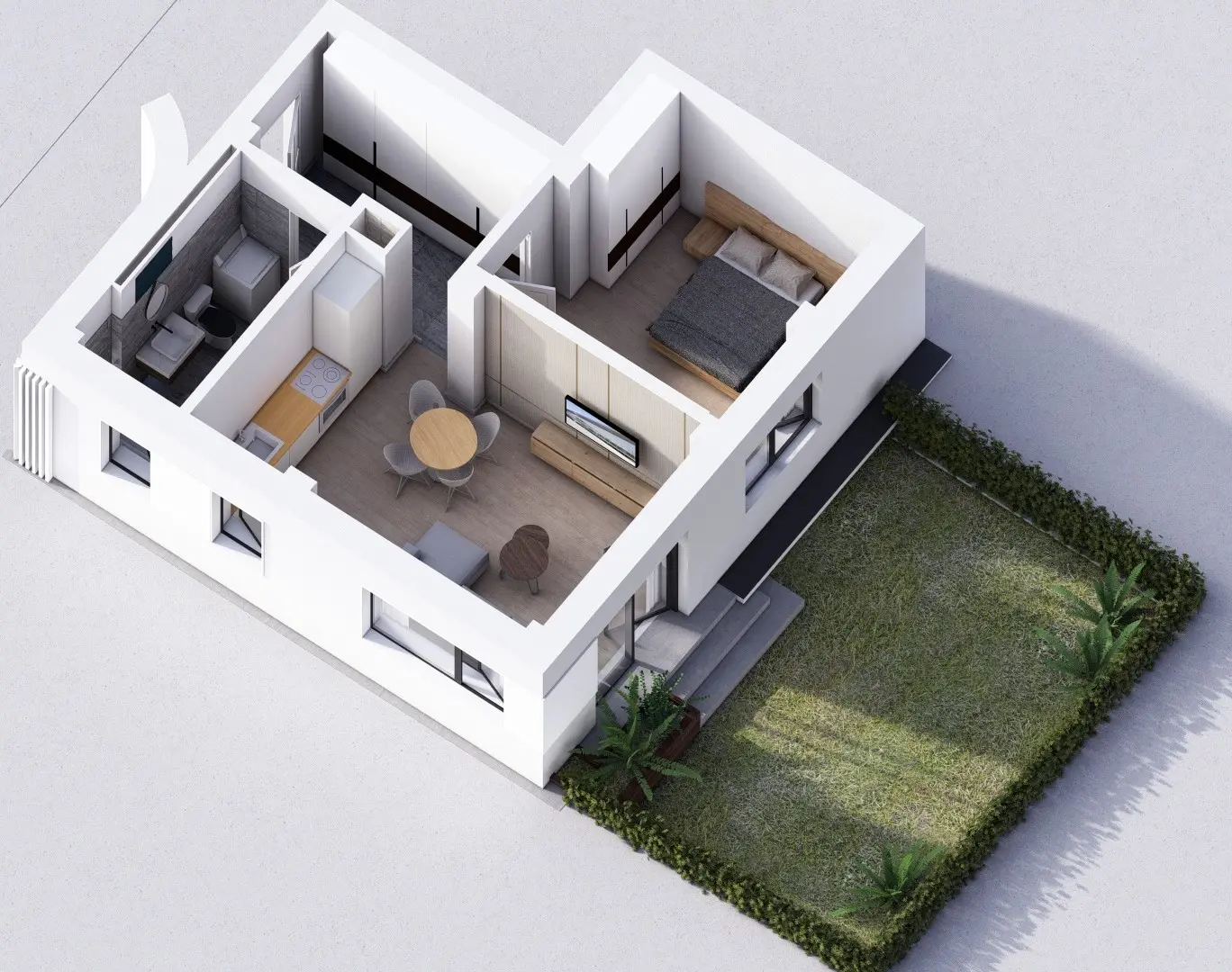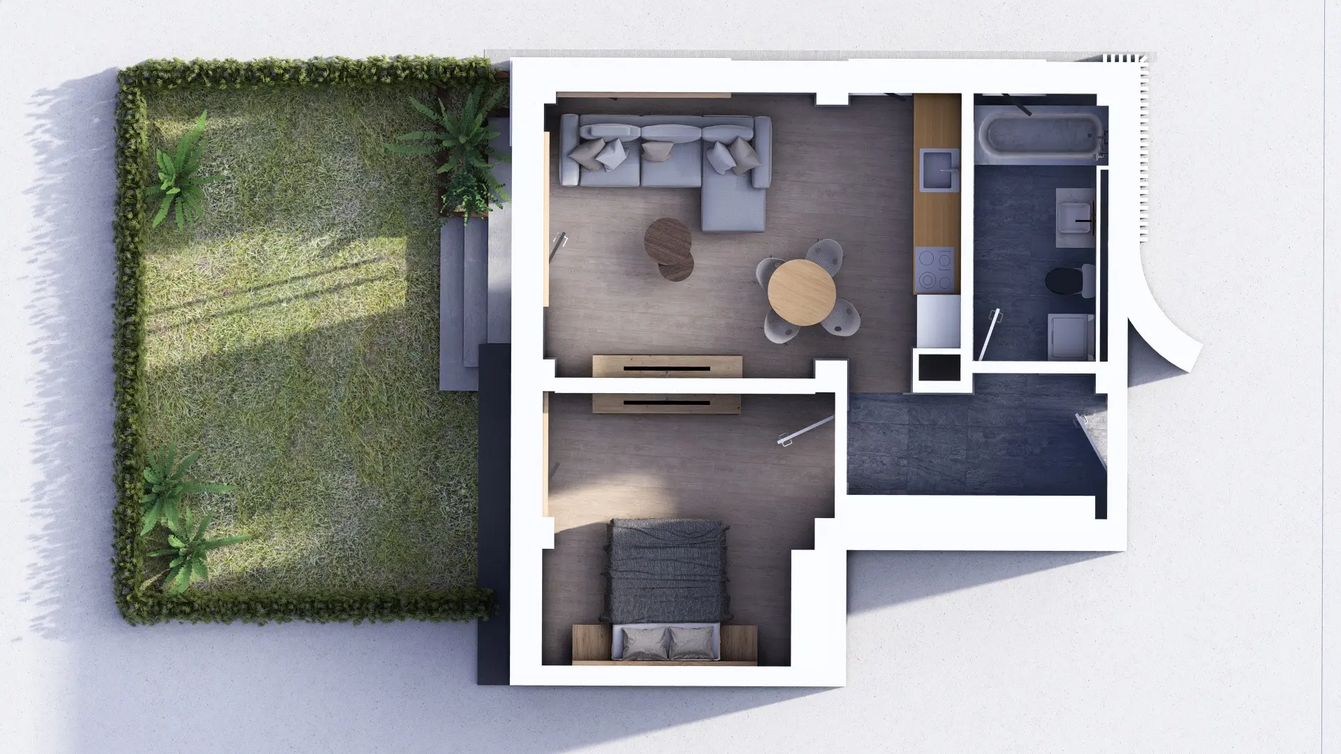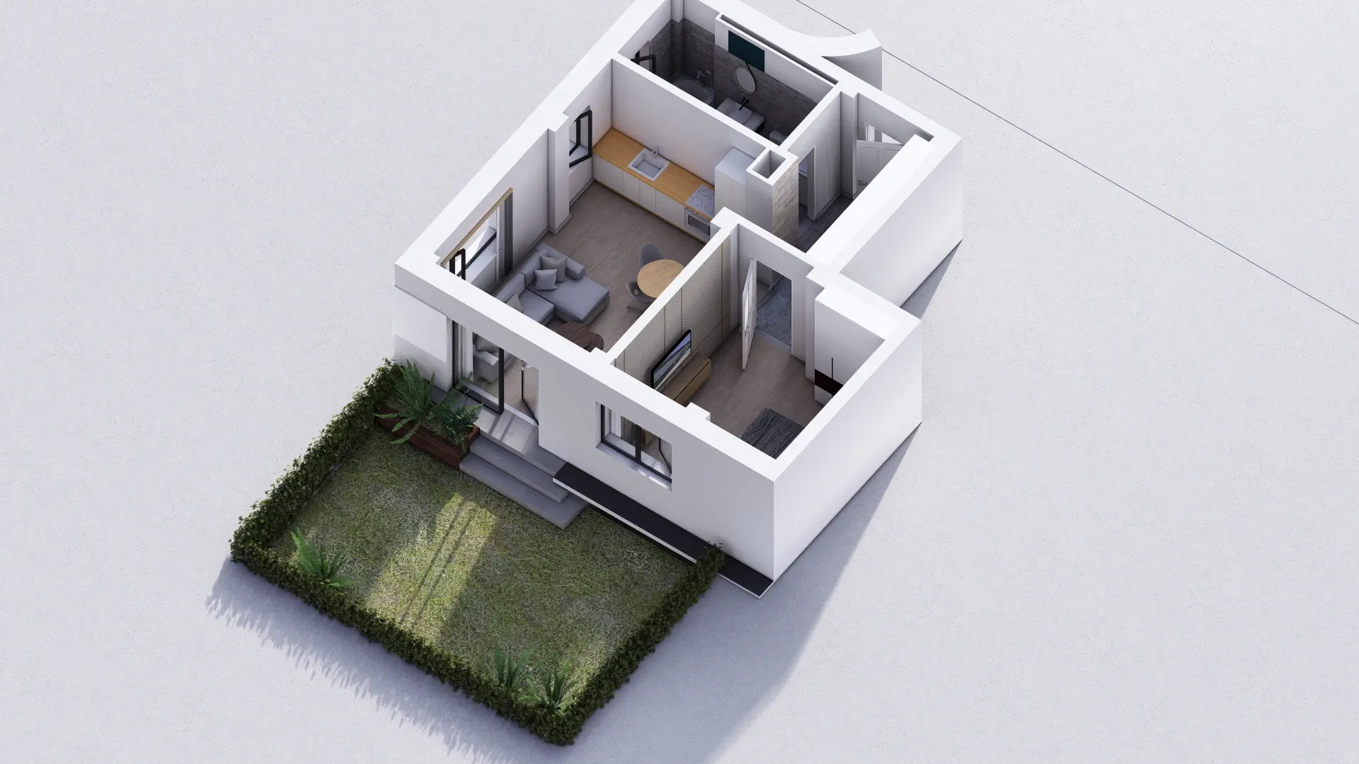 Baie luminoasă, ventilată natural și complet echipată — cadă sau duș la alegere, lavoar, vas WC cu rezervor încastrat și duș igienic. Fiecare client poate opta pentru varianta standard sau pentru pachetul premium al băii (cost suplimentar).