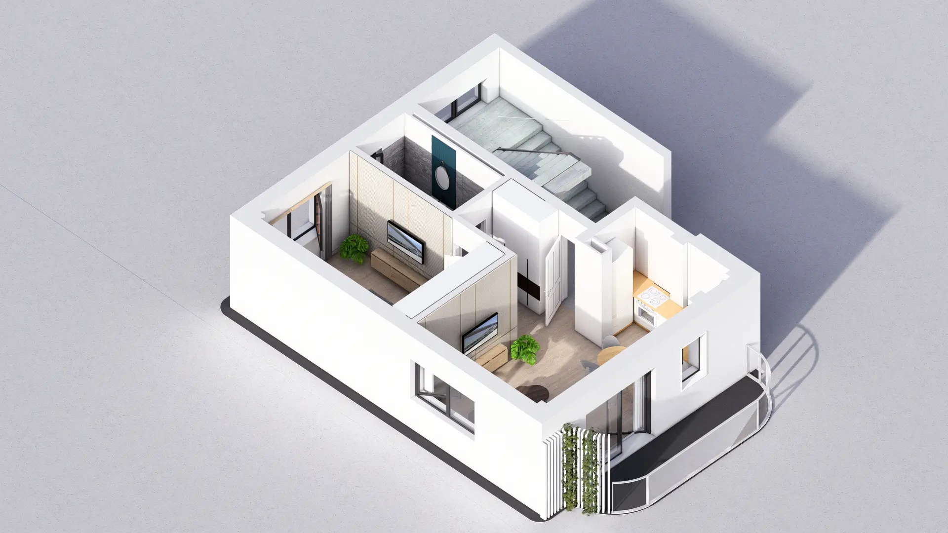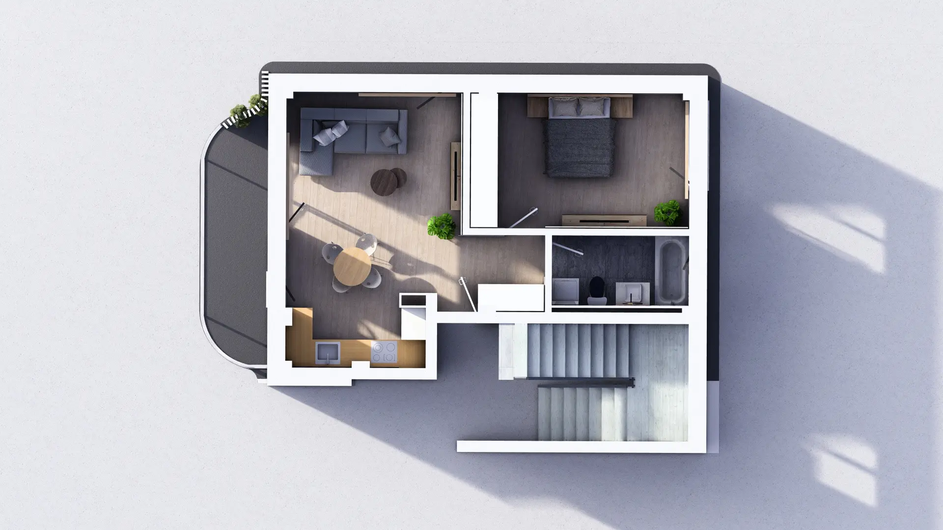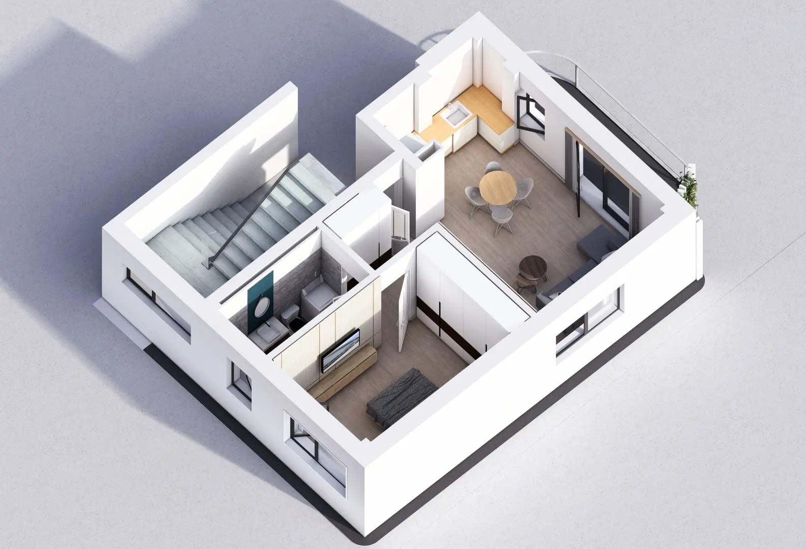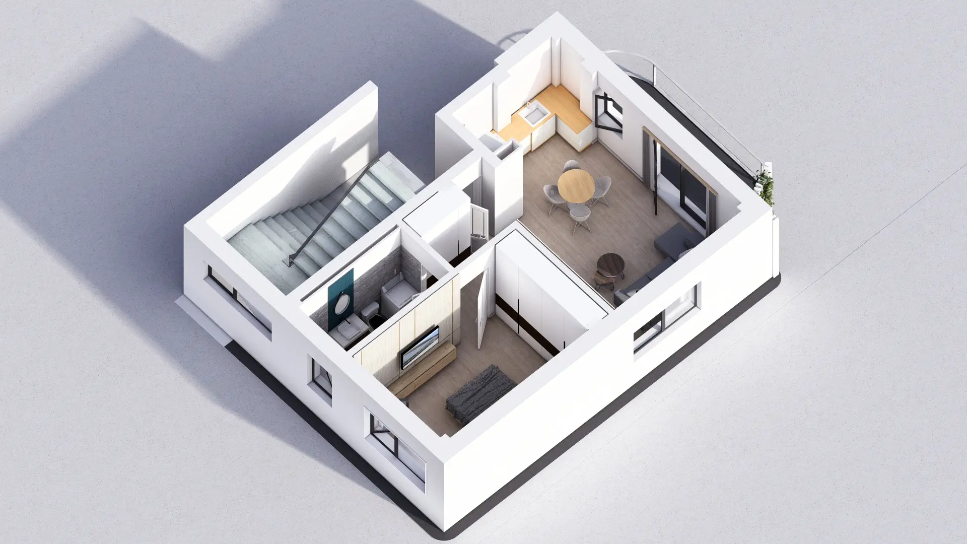 Baie luminoasă, ventilată natural și complet echipată — cadă sau duș la alegere, lavoar, vas WC cu rezervor încastrat și duș igienic. Fiecare client poate opta pentru varianta standard sau pentru pachetul premium al băii (cost suplimentar).