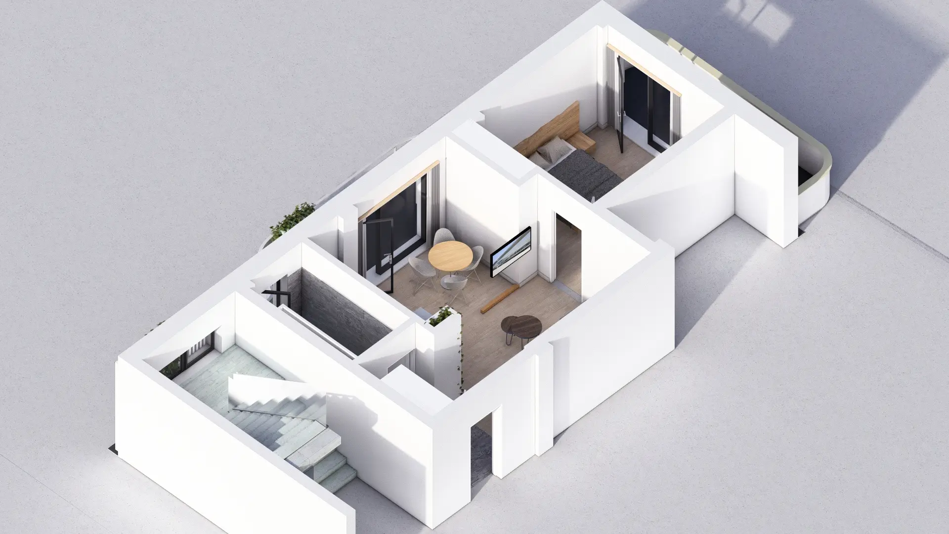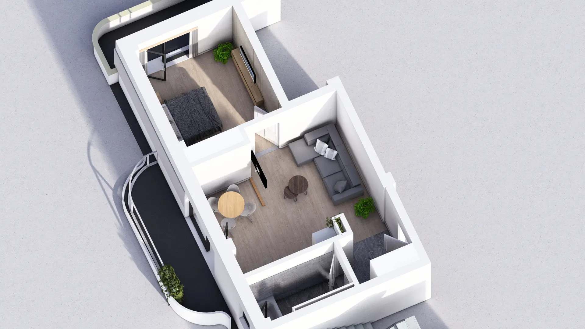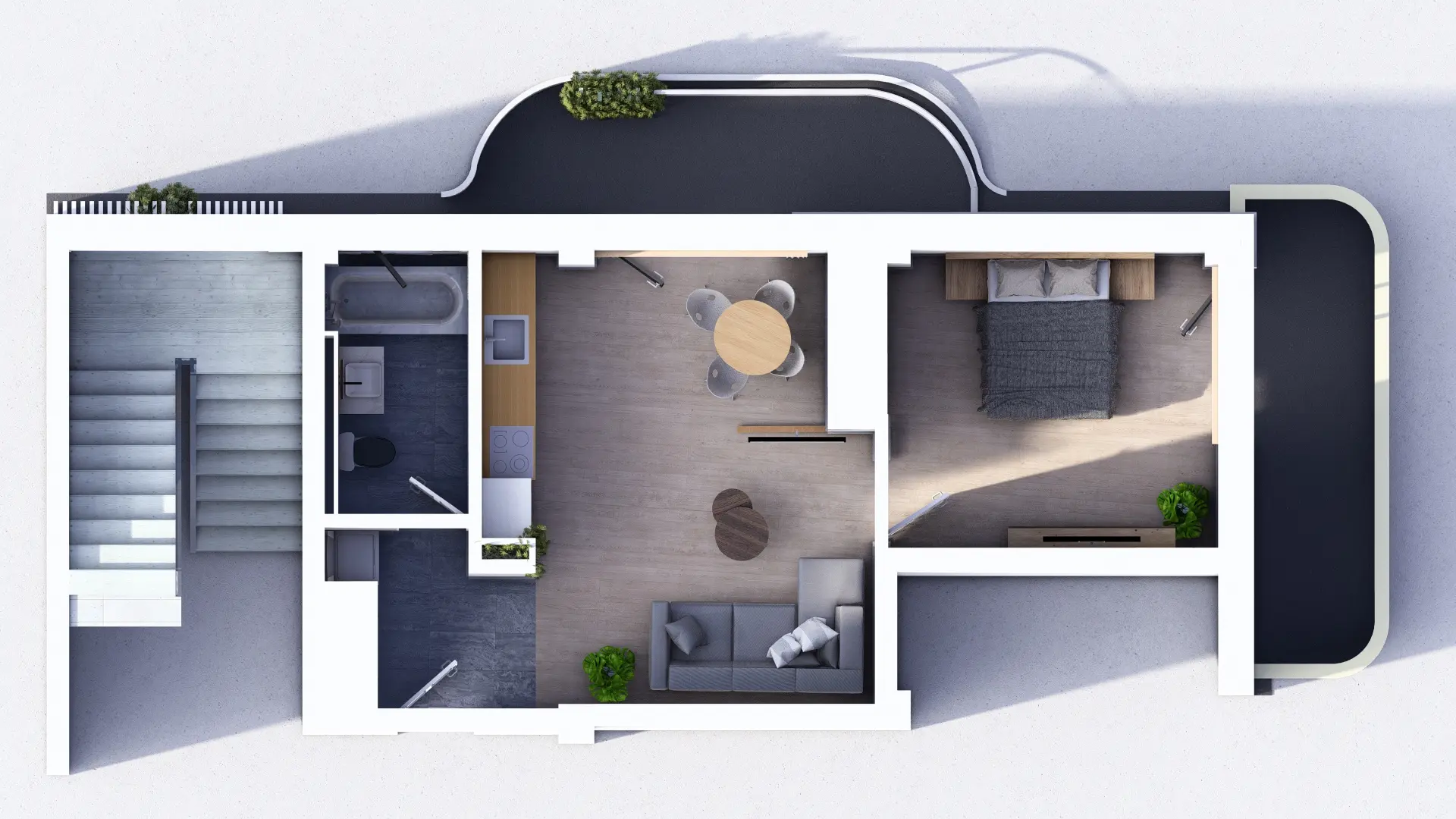 Baie luminoasă, ventilată natural și complet echipată — cadă sau duș la alegere, lavoar, vas WC cu rezervor încastrat și duș igienic. Fiecare client poate opta pentru varianta standard sau pentru pachetul premium al băii (cost suplimentar).